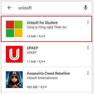 Quan sát thấy biểu tượng “kính lúp” trên màn hình. Chúng ta nhập tên ứng dụng Unistudent rồi nhấn chữ “Tìm kiếm”.